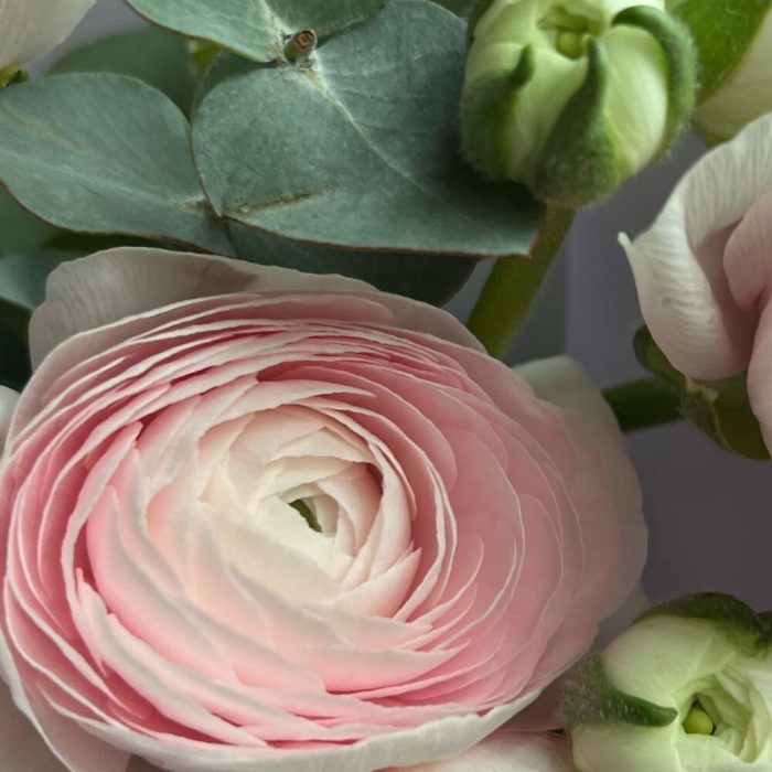 Ранункулюс – 7 шт.Эвкалипт – 3 шт.декоративная упаковка – 1 шт.Атласная лента – 1 шт.