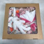 Гипсофила – 3 шт.Упаковка – 1 шт.Kinder bueno – 1 шт.Kinder сюрприз – 2 шт.Kinder chocolate – 1 шт.Raffaello конфеты – 10 шт.коробка крафт с окошком – 1 шт.игрушка зайчонок lapkin – 1 шт.