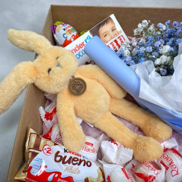 коробка крафтовая с крышкой – 1 шт.игрушка зайчонок lapkin – 1 шт.Kinder сюрприз – 2 шт.Kinder chocolate – 1 шт.Kinder bueno – 1 шт.Raffaello конфеты – 10 шт.Гипсофила – 3 шт.Упаковка – 1 шт.