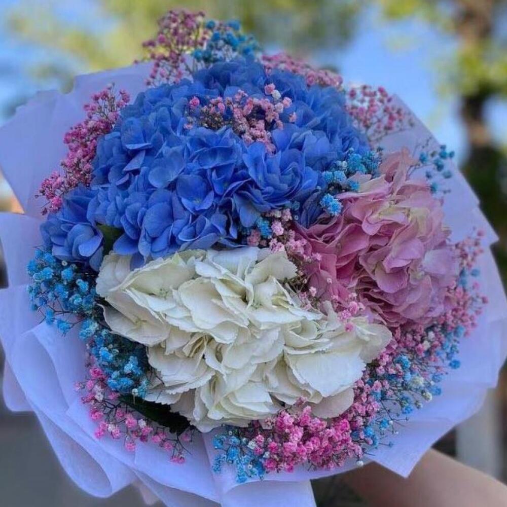 Гортензия розовая – 1 шт.гортензий голубая – 1 шт.Гортензия белая – 1 шт.гипсофила радужная – 12 шт.Упаковка дизайнерская – 1 шт.Лента атласная – 2 шт.Открыточка с вашими пожеланиями – 1 шт.хорошее настроение – 100 шт.инструкция по уходу за цветами – 1 шт.коробка переноска – 1 шт.Кризал – 1 шт.