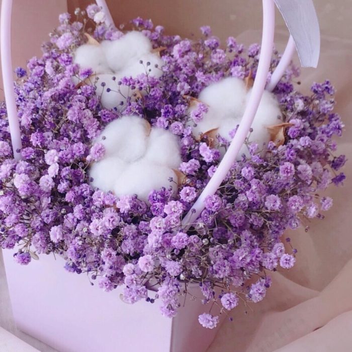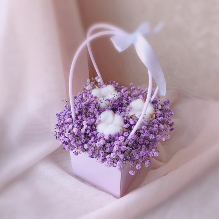Очаровательная композиция из изысканных свежих цветов.Наполнена множеством соцветий фиолетовой гипсофилы и мягкого хлопка. Собрана в стильной сумочке.Композиция из гипсофилы – необычный подарок, который удивит своей невероятной стойкостью, при правильном и простом уходе.❤️ Ставить композицию в прохладном месте, избегая отопительных приборов и прямых солнечных лучей. ❤️ Подливать немного воды в серединку.Гипсофила не вянет, а становится сухоцветом, сохраняя свой вид. Поэтому композиция продолжит радовать ещё очень долго!Чтобы защитить готовый букет во время доставки от любых погодных условий, мы бережно его упаковываем