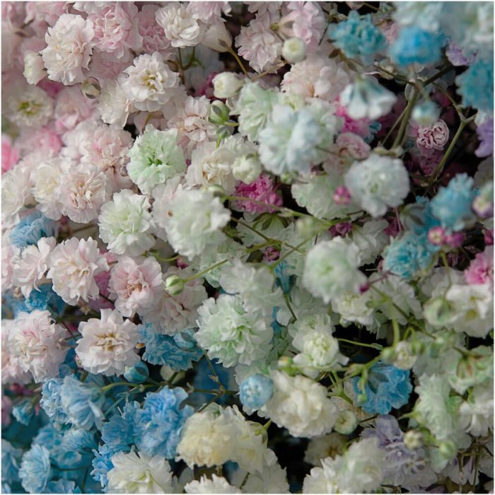 гипсофила радужная эквадор – 45 шт.Шляпная коробка – 1 шт.Оазис флористический – 1 шт.Лента атласная – 1 шт.любовь флориста (бесплатно) – 1 шт.инструкция по уходу за цветами – 1 шт.