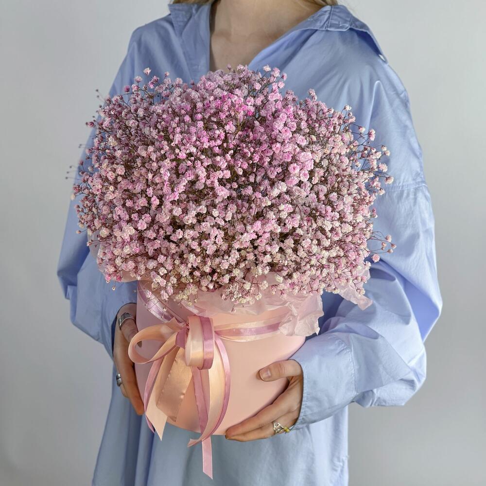 Гипсофила – 9 шт.Лента – 2 шт.Тишью – 1 шт.Коробка шляпная – 1 шт.Оазис флористический – 1 шт.