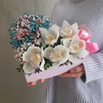 Орхидеи с рускусом в шляпной коробке. Букет 278 ALMOND ROSES