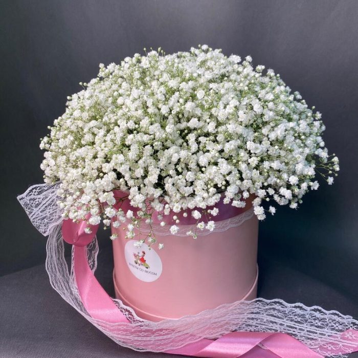 “Сиреневый туман” – композиция из гипсофилы в шляпной коробке
