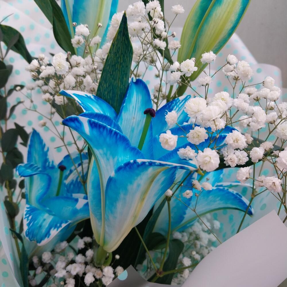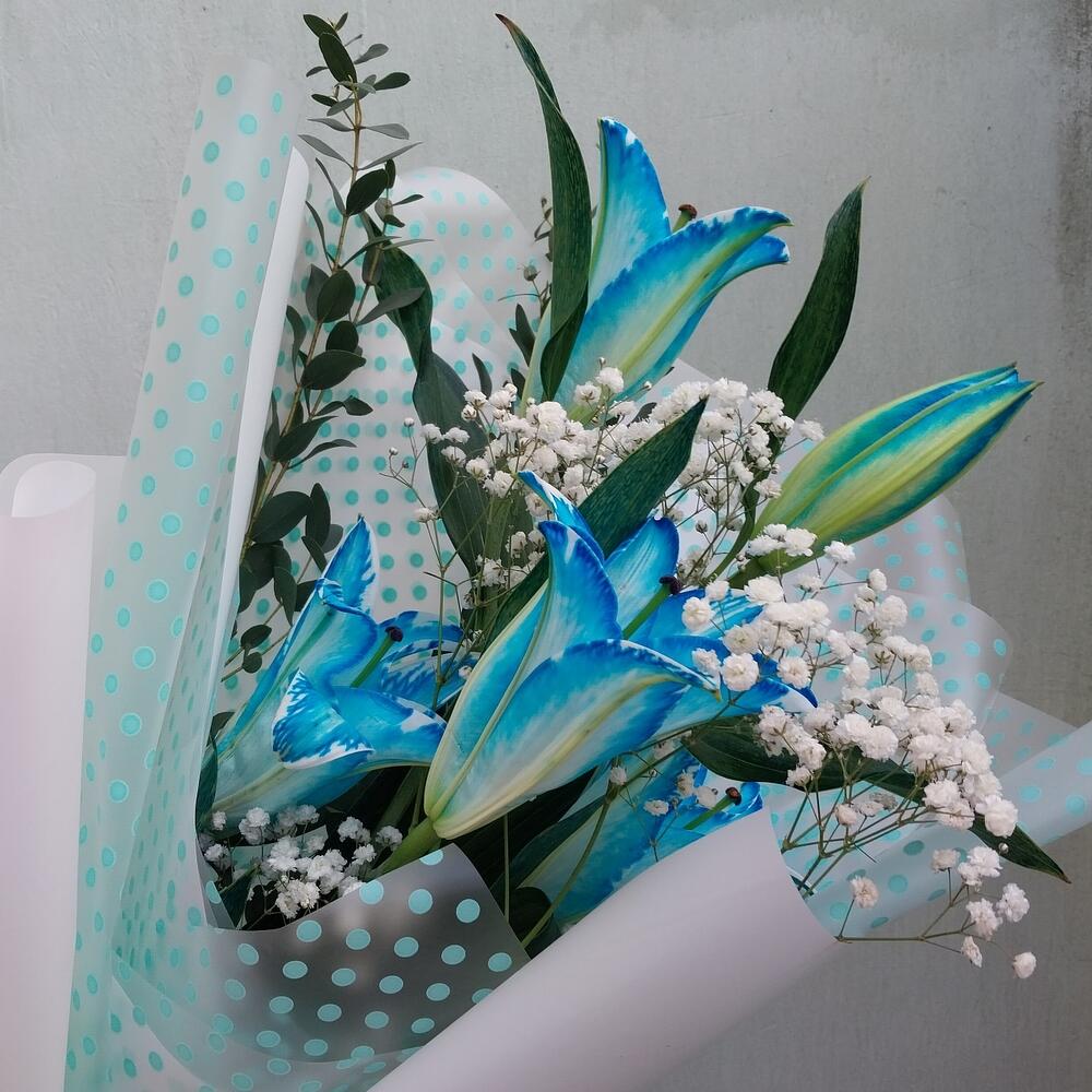 Гипсофила – 1 шт.Эвкалипт – 2 шт.Упаковка дизайнерская – 6 шт.лилия евро голубая – 1 шт.