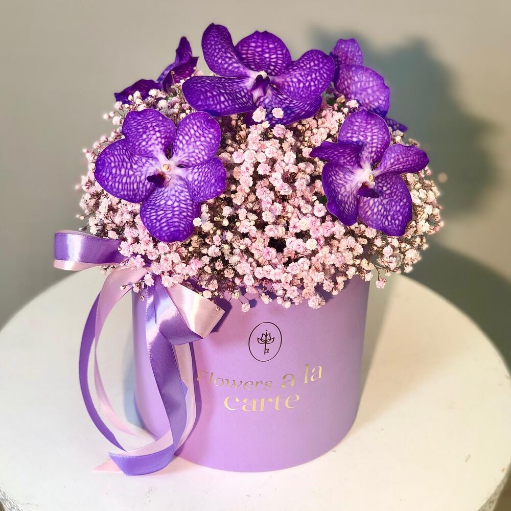 Коробка шляпная большая – 1 шт.Оазис флористический – 1 шт.Гипсофила – 8 шт.Орхидея Ванда – 5 шт.Лента атласная – 2 шт.