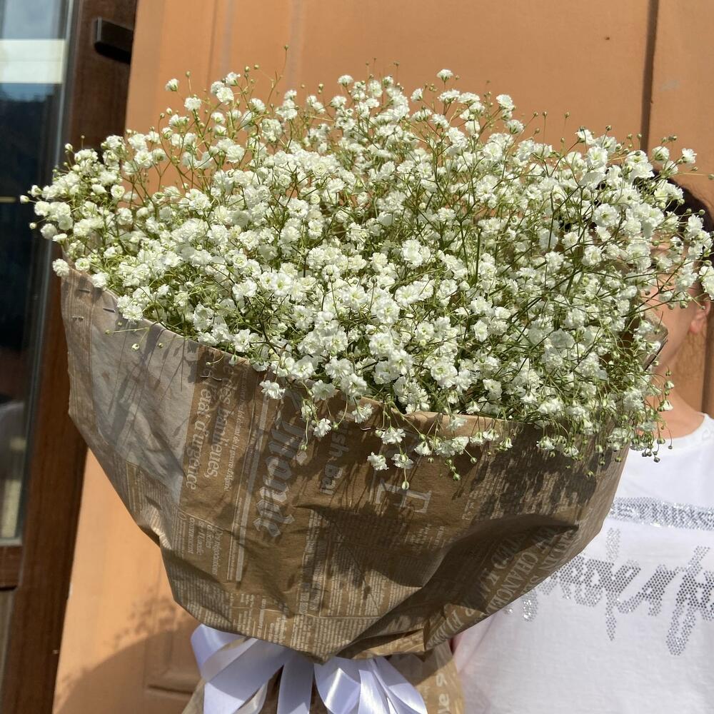 Гипсофила – 11 шт.Упаковка дизайнерская – 3 шт.Лента атласная – 1 шт.