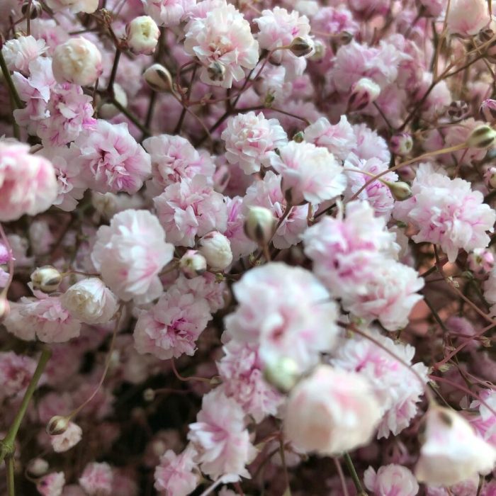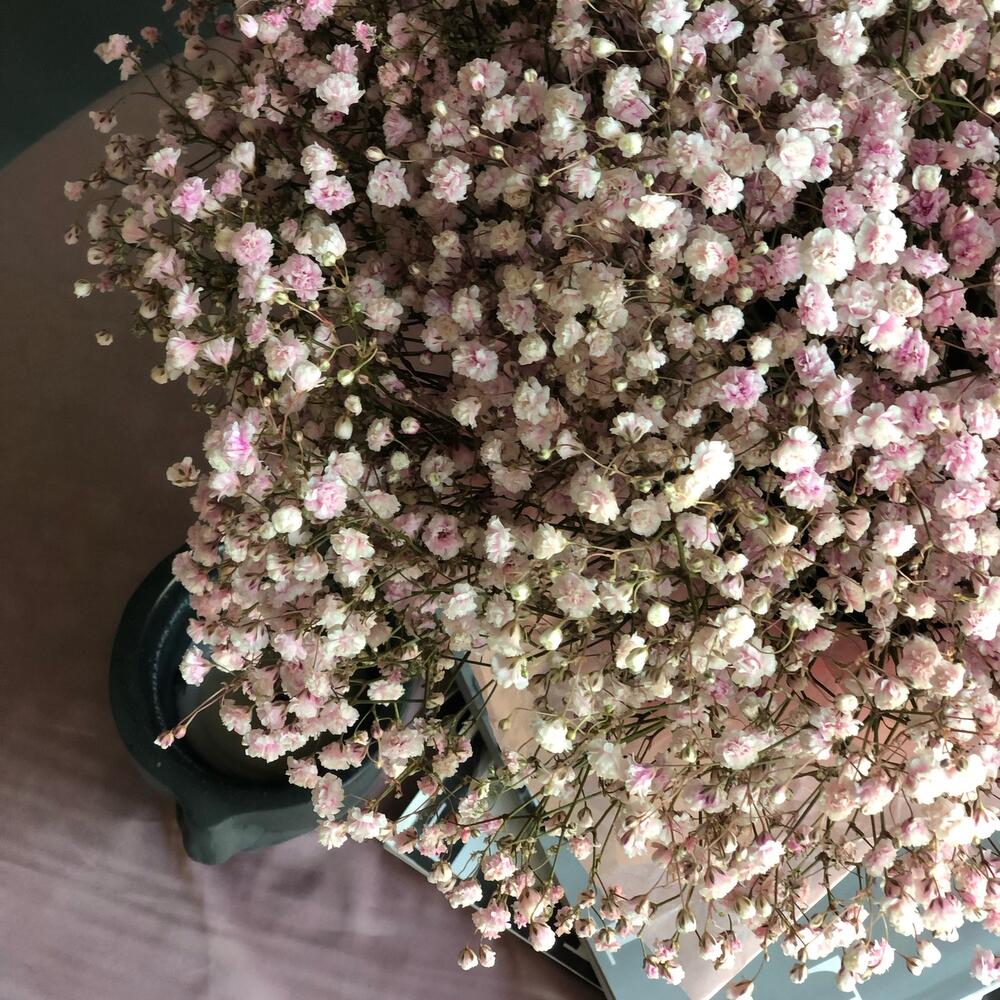 Розовое облако нежной гипсофилы в шляпной коробке с фирменными лентами