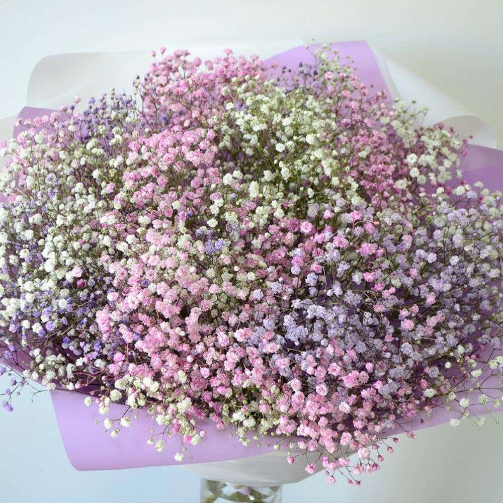 Красивый и очень большой букет цветов с цветной гипсофилой.В составе букета: гипсофила разноцветная 25 шт., дизайнерская упаковка букета.