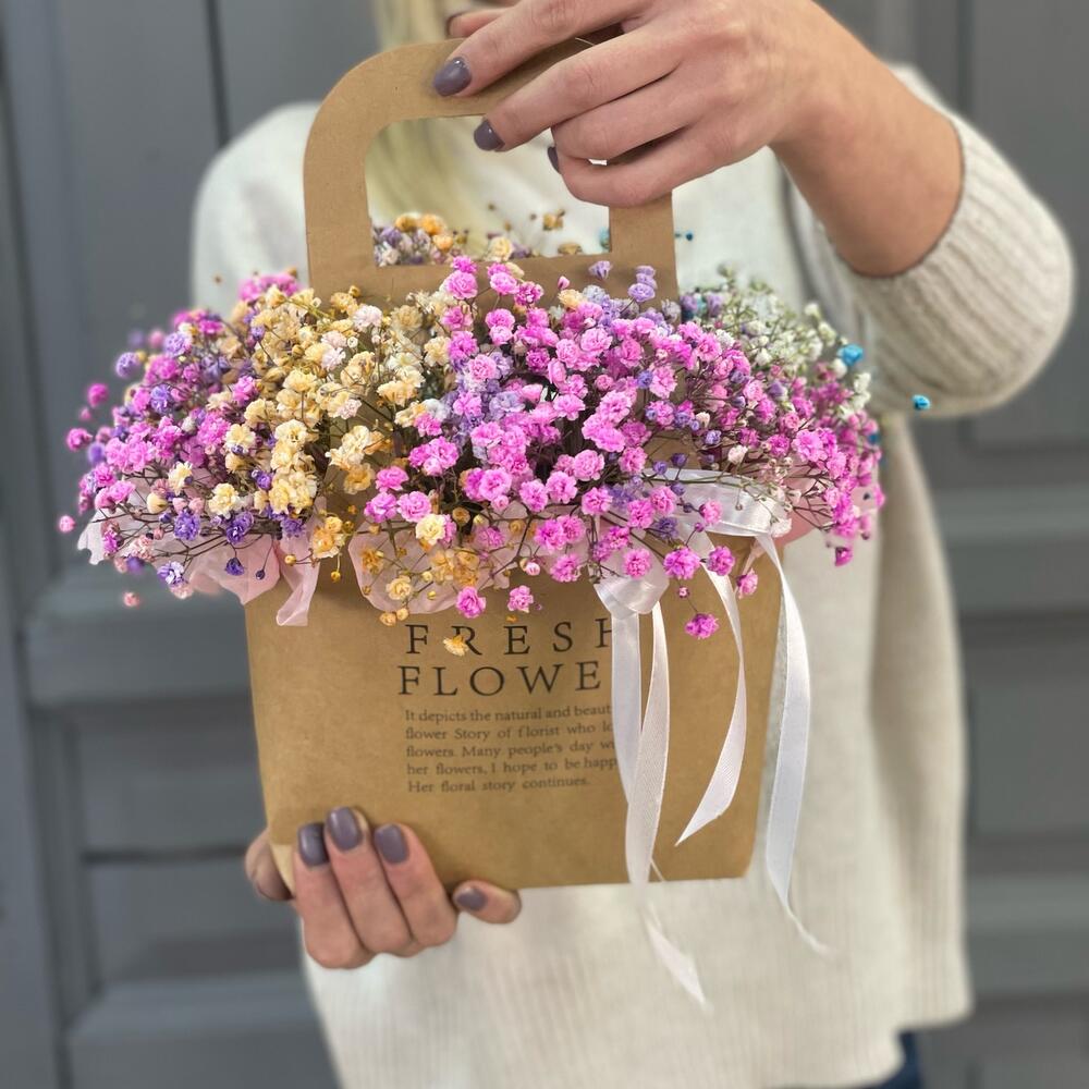 “Сиреневый туман” – композиция из гипсофилы в шляпной коробке