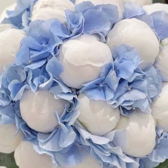 Букет из белых пионов и голубой гортензии