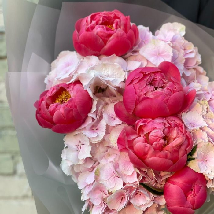 Гортензия – 5 шт.Пион Коралл Шарм (Coral Charm) – 7 шт.Лента атласная – 1 шт.Фисташка – 2 шт.Упаковка дизайнерская – 5 шт.лента силиконовая брендированная – 1 шт.