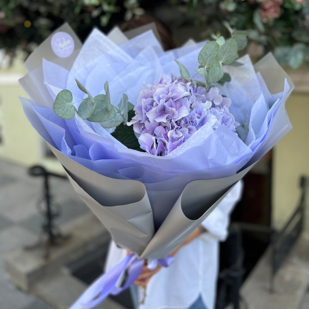 Букет-комплимент с сиреневой гортензией и эвкалиптом в серой упаковке