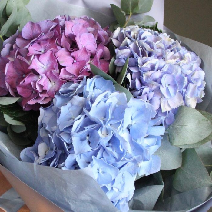 Гортензия – 3 шт.Эвкалипт – 5 шт.Тишью – 3 шт.Упаковка – 3 шт.Лента – 1 шт.