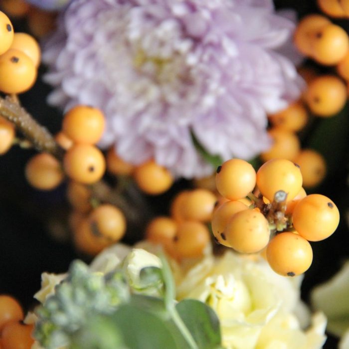 Дельфиниум – 2 шт.Гортензия – 2 шт.Илекс – 2 шт.Астра – 3 шт.Маттиола – 3 шт.Георгина – 3 шт.ирландский колокольчик – 3 шт.Эвкалипт – 5 шт.Тишью – 2 шт.Упаковка – 2 шт.Лента атласная – 1 шт.