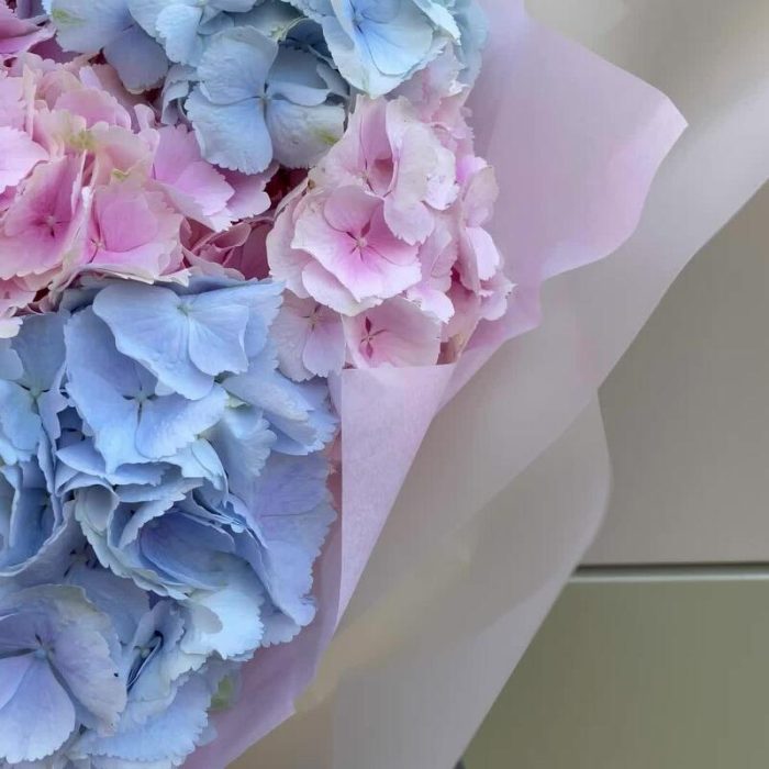 Нежное воздушное облако из микса гортензий Очень объемный букет в воздушной матовой полупрозрачной упаковке