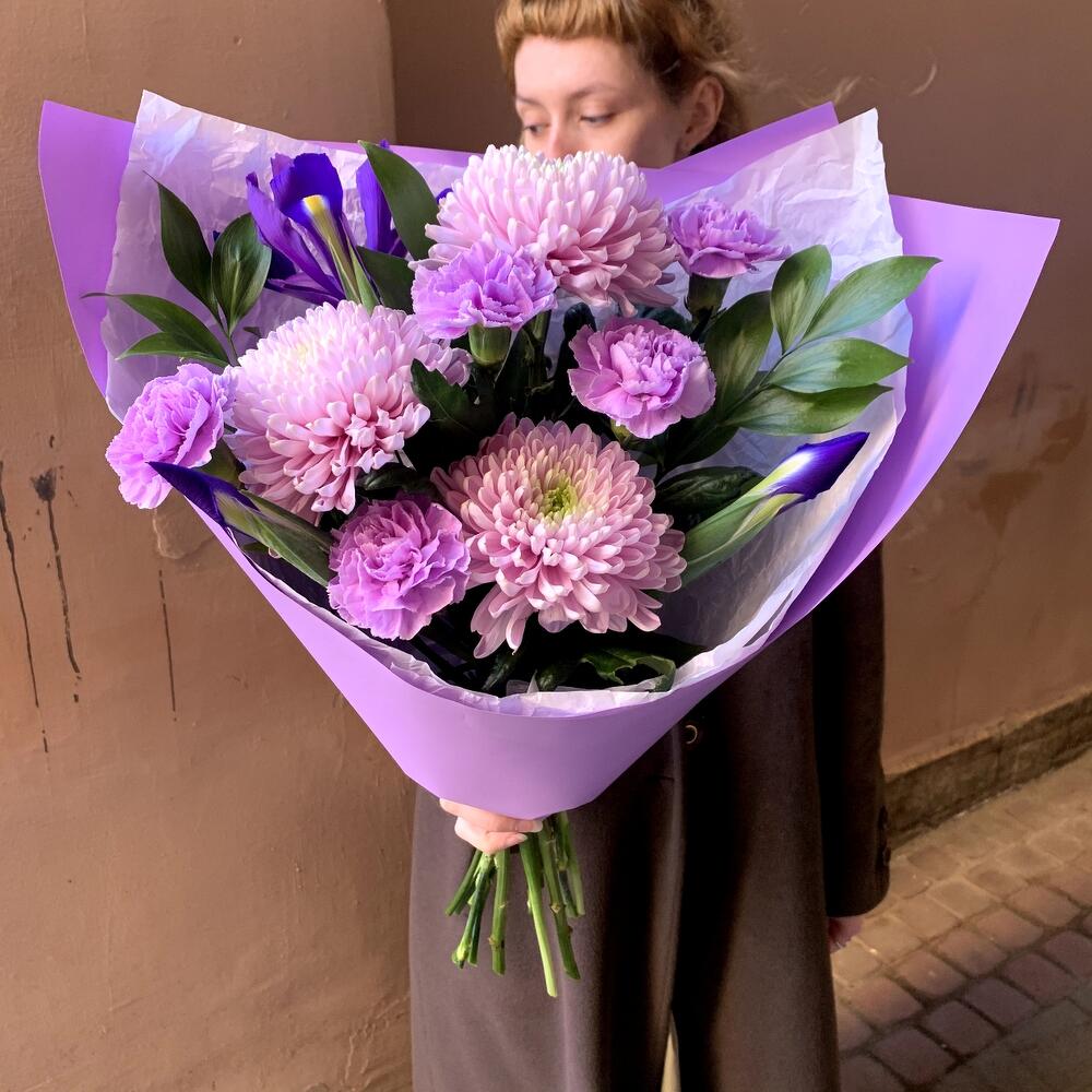 Гвоздика лунная – 5 шт.Ирис синий – 3 шт.Рускус сочи – 5 шт.Авторская упаковка – 1 шт.хризантема сиреневая одноголовая – 3 шт.