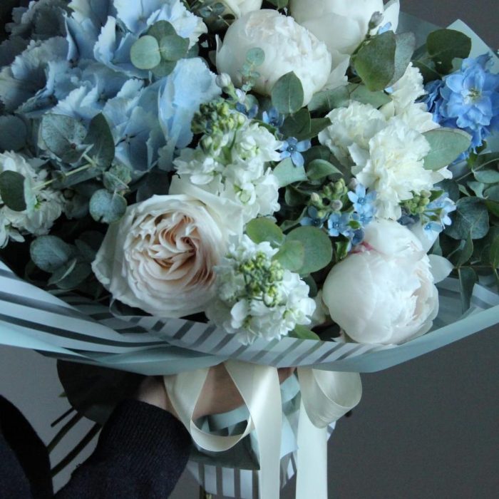 Дельфиниум – 2 шт.Твидия – 5 шт.Ранункулюс – 3 шт.Пион – 3 шт.Маттиола – 3 шт.Гвоздика – 5 шт.Упаковка дизайнерская – 2 шт.Лента атласная – 1 шт.