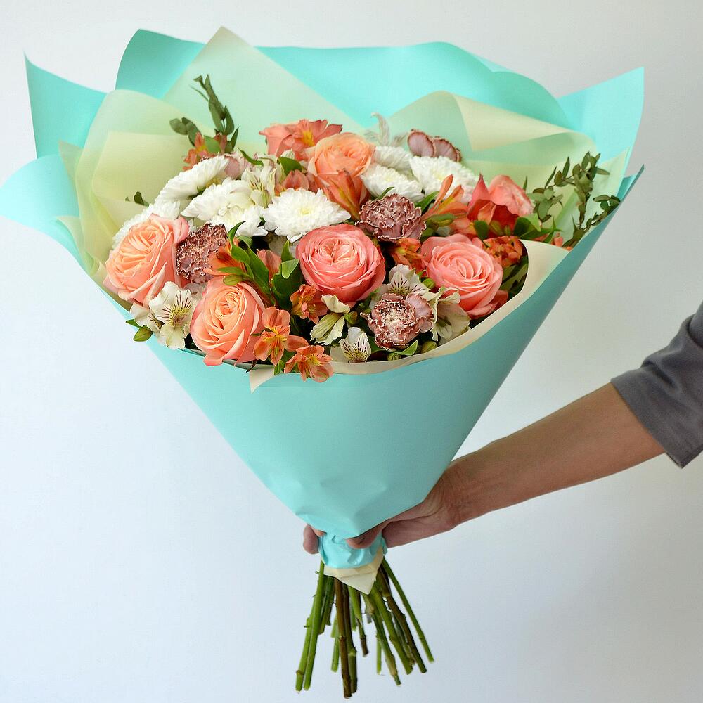 Альстромерия – 9 шт.Хризантема кустовая – 3 шт.Зелень – 1 шт.Диантус – 5 шт.Оригинальная упаковка – 1 шт.пионовидные розы – 7 шт.