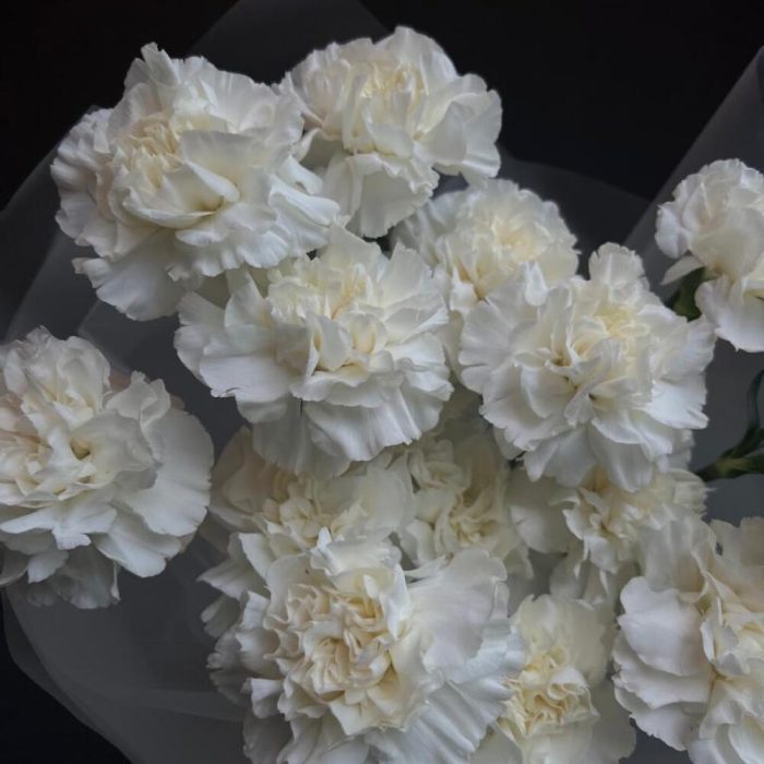 белые гвоздики – 15 шт.декоративная упаковка – 1 шт.Атласная лента – 1 шт.