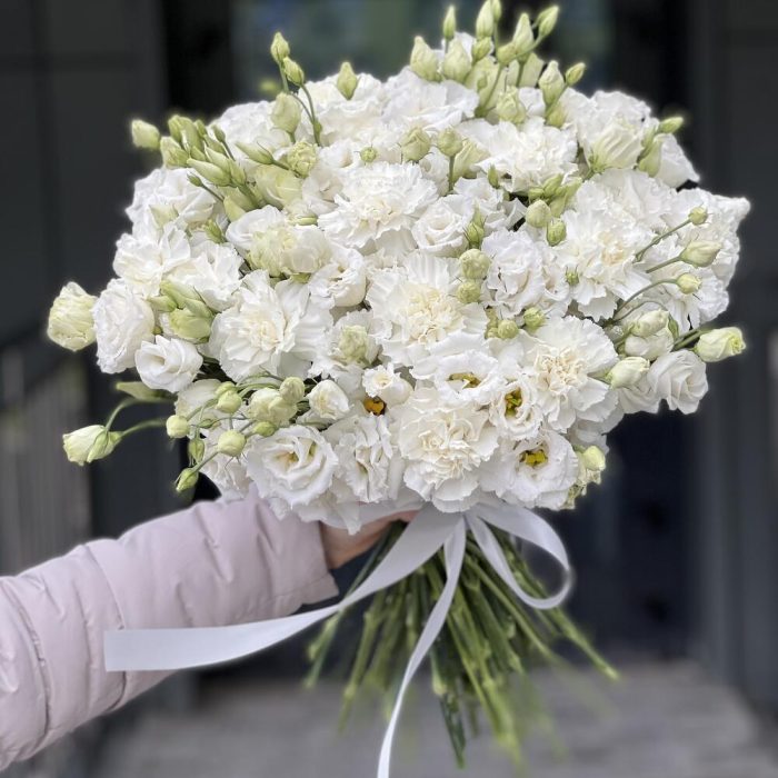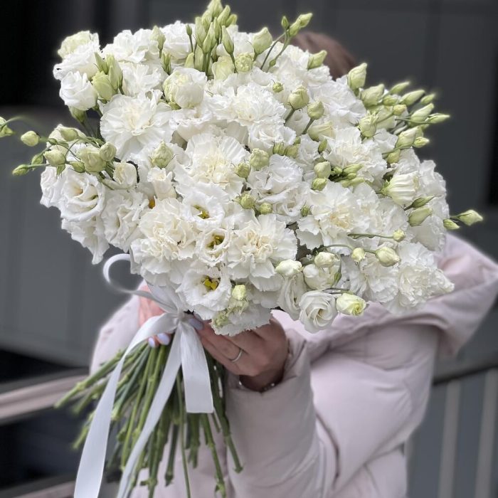 Букет оформленный под ленту из белых гвоздик и кружевной эустомы!