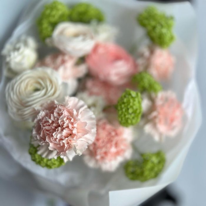 Ранункулюс – 3 шт.Вибурнум – 2 шт.Гвоздика – 6 шт.эустома белая – 2 шт.