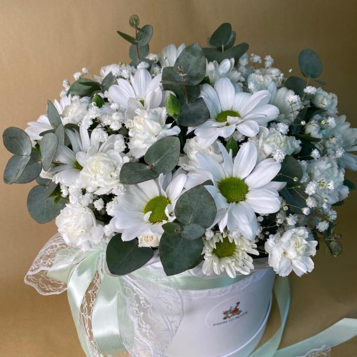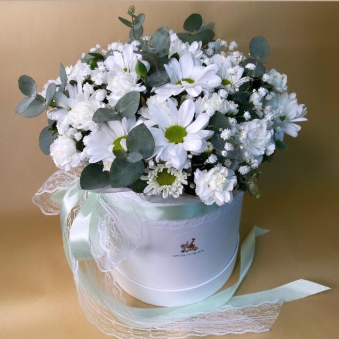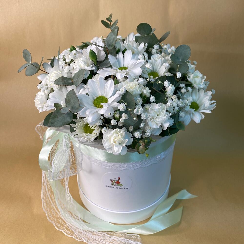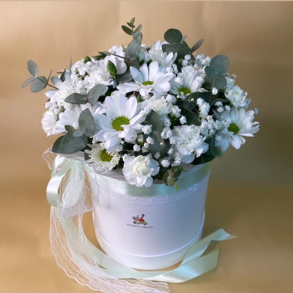 Букет из цветов и хлопка в декоративной коробке "Райское наслаждение"