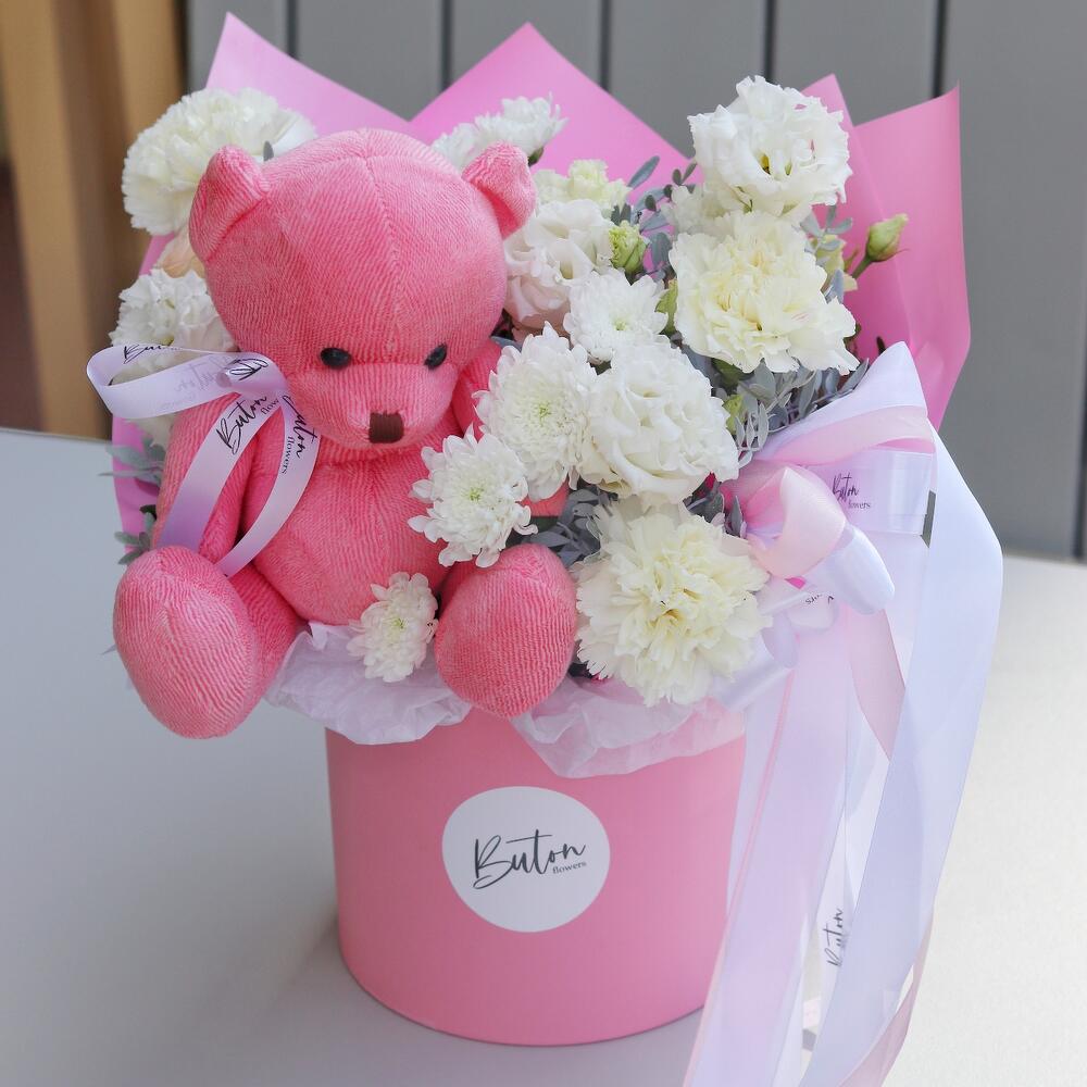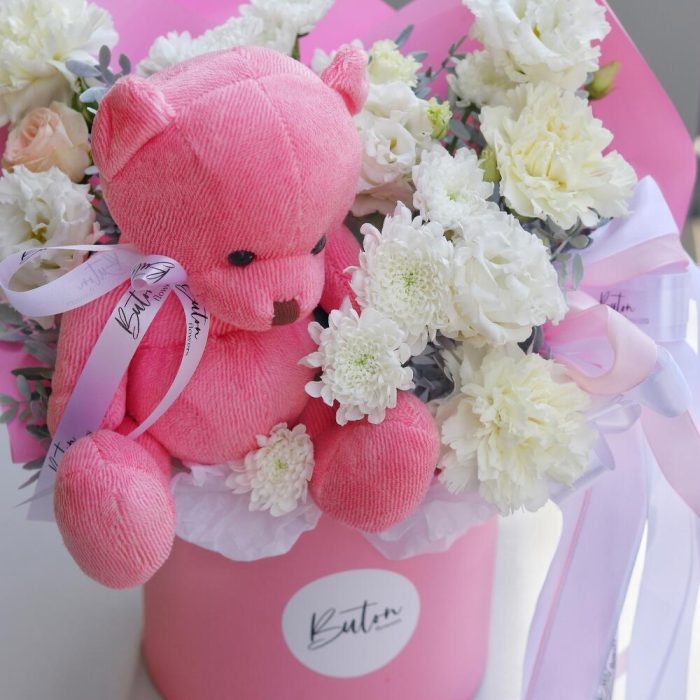Лизиантус – 1 шт.Гвоздика – 3 шт.Лента атласная – 1 шт.Тишью – 1 шт.Сантини – 2 шт.Шляпная коробка – 1 шт.Мишка плюшевый – 1 шт.Открыточка с вашими пожеланиями – 1 шт.Шоколадка – 1 шт.