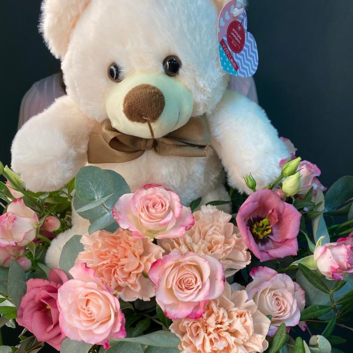 Медведь плюшевый – 1 шт.Роза кустовая – 2 шт.Лизиантус – 2 шт.Диантус – 3 шт.Гиперикум – 1 шт.Альстромерия – 1 шт.Эвкалипт – 1 шт.Фисташка – 3 шт.Шляпная коробка с лентами – 1 шт.Губка флористическая – 1 шт.Топпер сердце – 1 шт.