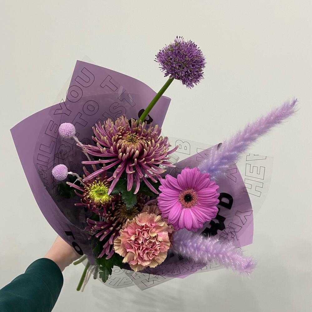 Хризантема – 2 шт.Гвоздика – 2 шт.Гербера – 1 шт.Аллиум – 1 шт.камыш декоративный – 2 шт.Краспедия – 2 шт.Упаковка дизайнерская – 1 шт.