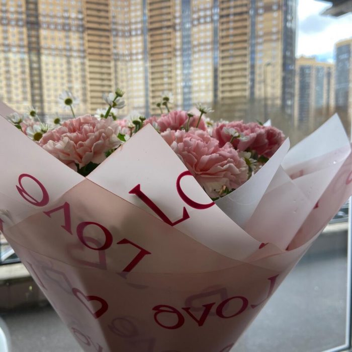 Лента – 1 шт.Матрикария – 8 шт.Диантус розовый – 9 шт.Упаковка матовая пленка – 1 шт.