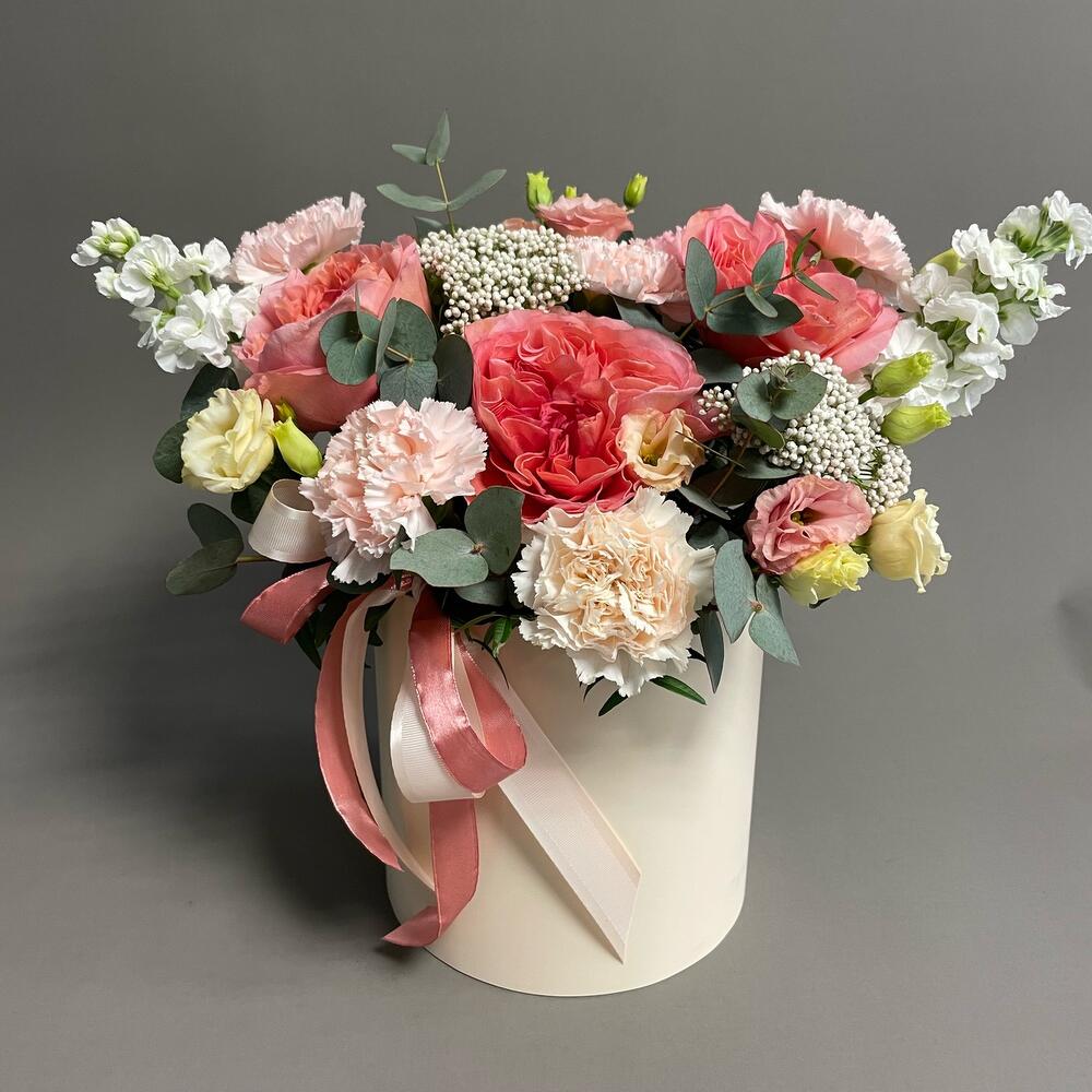 Маттиола – 2 шт.Озотамнус – 2 шт.Эвкалипт – 3 шт.Эустома – 4 шт.Лента атласная – 2 шт.Диантус – 5 шт.Коробка шляпная – 1 шт.Оазис флористический – 1 шт.розы – 3 шт.