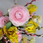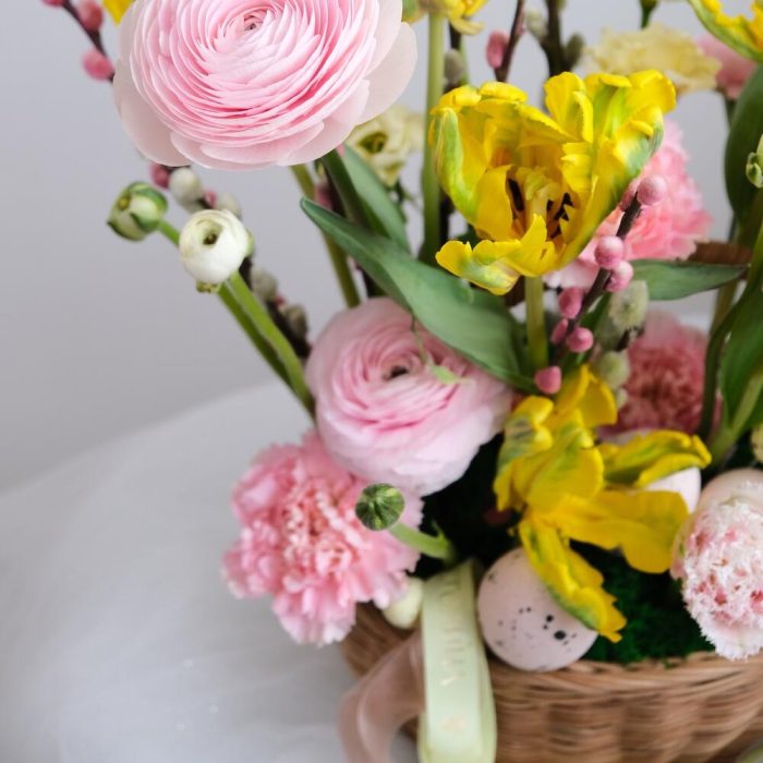 Верба – 6 шт.Лизиантус – 2 шт.Тюльпан – 5 шт.Гвоздика – 7 шт.Ранункулюс – 2 шт.Корзина плетеная – 1 шт.Мох натуральный – 1 шт.Оазис флористический – 1 шт.