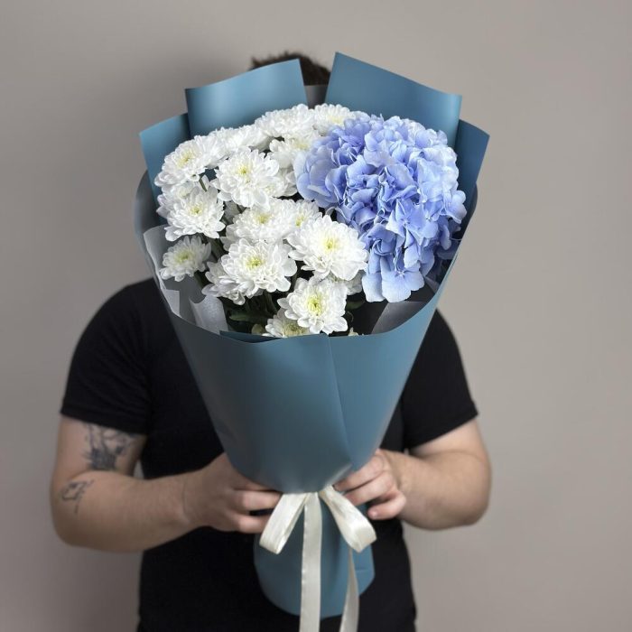 Авторский букет с голубыми гортензиями
