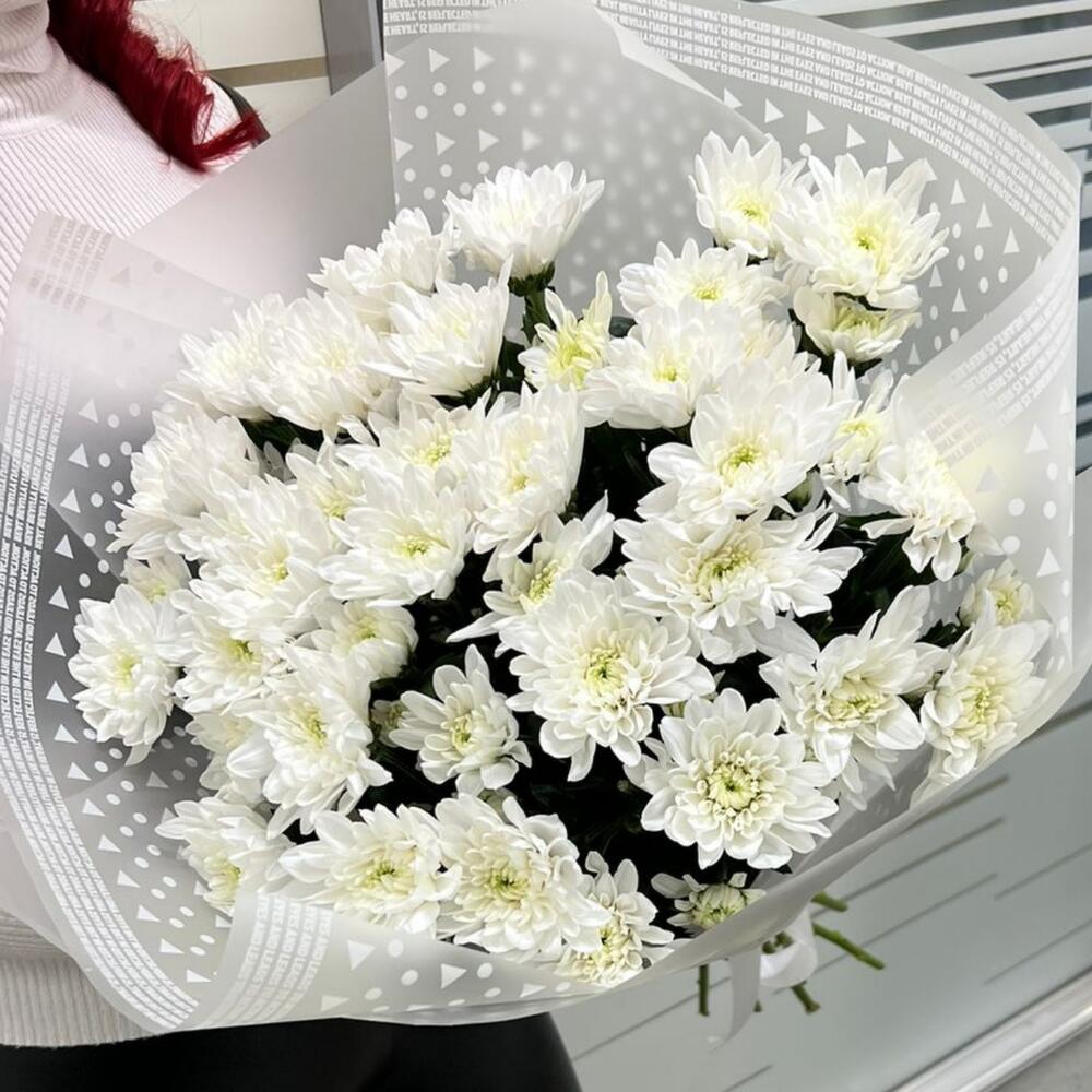 Упаковка – 2 шт.Лента атласная – 1 шт.Хризантема кустовая белая – 9 шт.