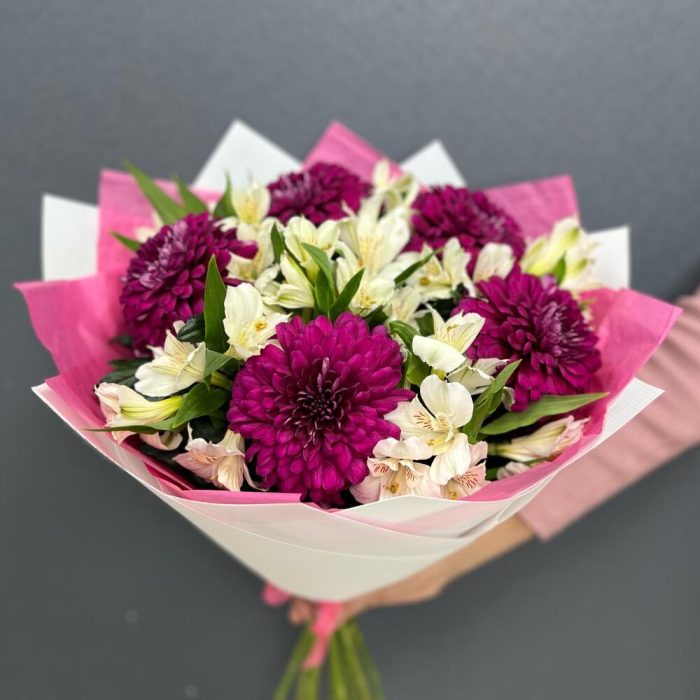 Альстромерия – 6 шт.Лента атласная – 2 шт.Тишью – 2 шт.Пленка матовая – 2 шт.ламира хризантема – 5 шт.