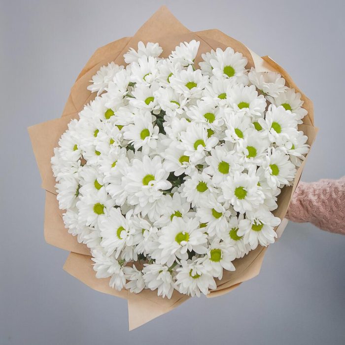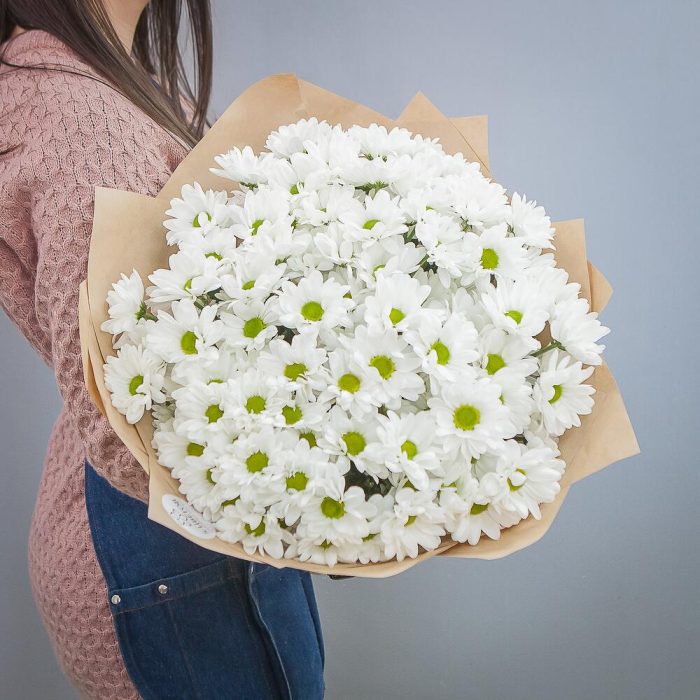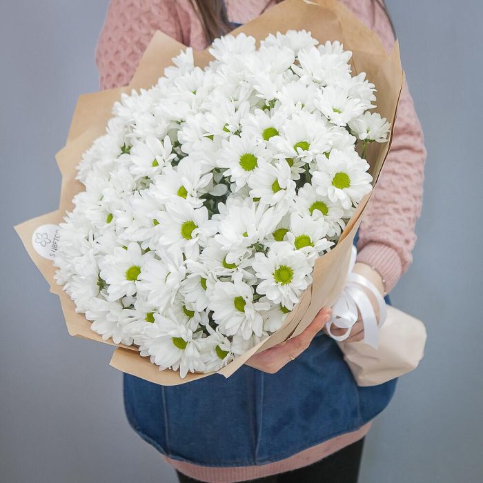 хризантемы – 15 шт.дизайнерская упаковка и атласная лента – 1 шт.