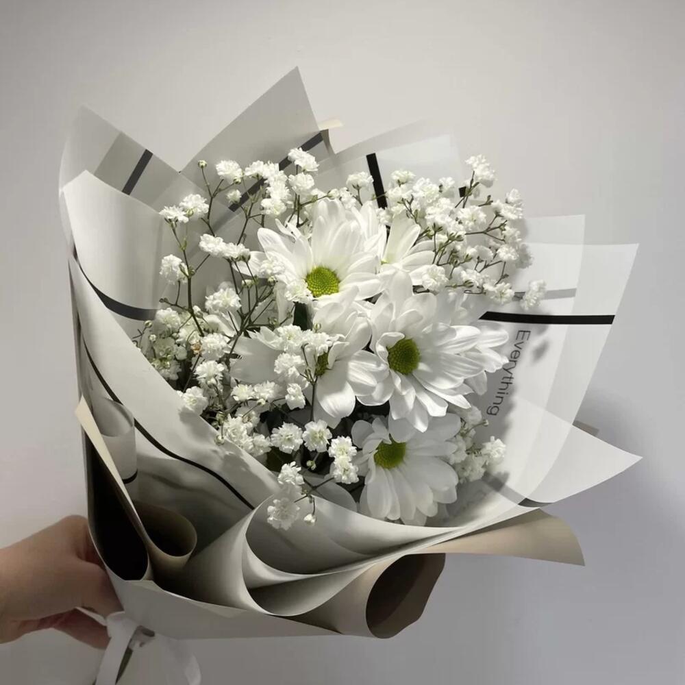 Хризантема кустовая белая – 2 шт.гипсофила белая – 1 шт.Корейская пленка – 1 шт.Лента атласная – 1 шт.