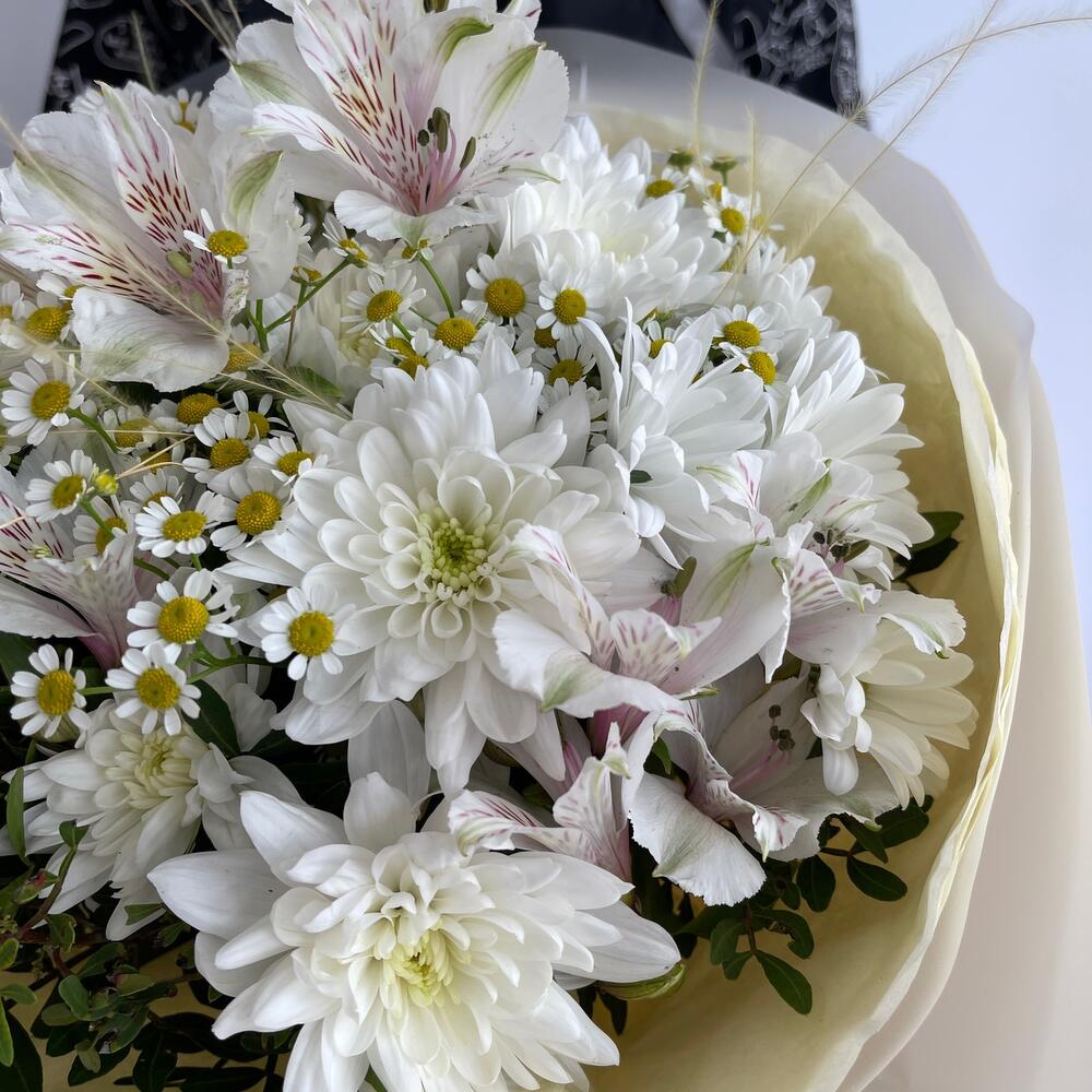 Альстромерия – 3 шт.Хризантема кустовая – 3 шт.Ромашка – 5 шт.Пленка – 2 шт.фисиашка – 2 шт.