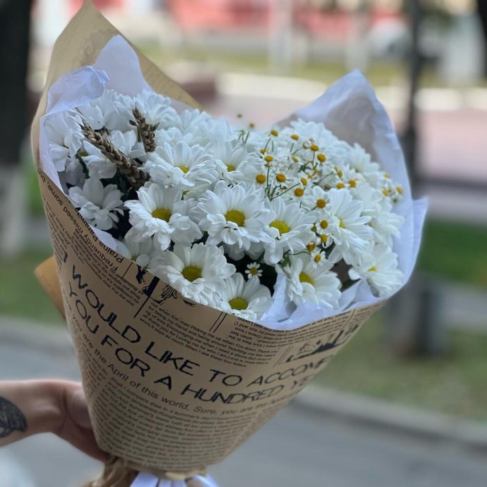 Хризантема кустовая – 5 шт.Ромашка кустовая – 2 шт.Сухоцветы – 3 шт.Упаковка дизайнерская – 1 шт.Кризал (подкормка) – 1 шт.