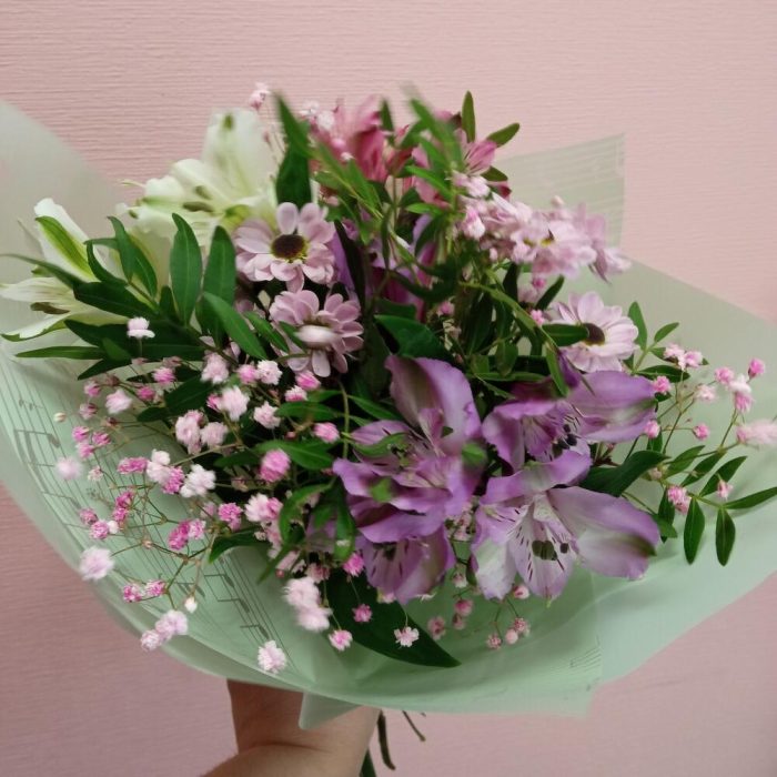 Букет с альстромериями, кустовой розой, гвоздикой и ваксфлауэром
