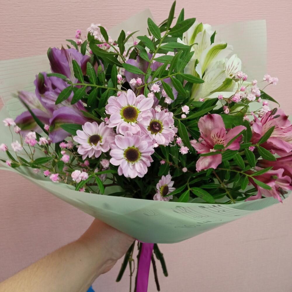 Альстромерия – 3 шт.Хризантема Сантини – 4 шт.Упаковка – 1 шт.Лента атласная – 1 шт.зелень декоративная – 2 шт.гипсофила радужная – 1 шт.