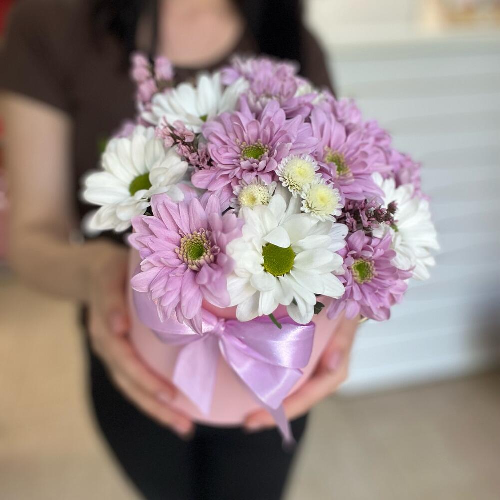 Хризантема кустовая сиреневая – 2 шт.Хризантема кустовая белая – 1 шт.Хризантема Сантини – 1 шт.Статица – 1 шт.Зелень – 1 шт.Шляпная коробка – 1 шт.Флористическая губка – 1 шт.Атласная лента – 1 шт.Открыточка с вашими пожеланиями – 1 шт.