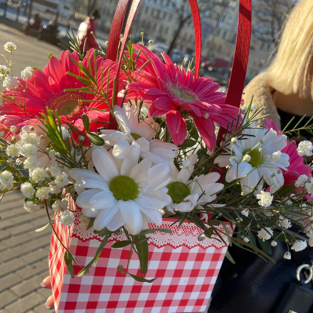 Гербера – 3 шт.Хризантема кустовая – 1 шт.Гипсофила – 1 шт.Оазис флористический – 1 шт.Сумочка картонная – 1 шт.Фисташка пучок – 1 шт.