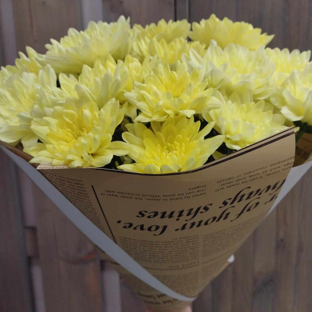 Хризантема кустовая белая – 3 шт.Хризантема кустовая крашенная – 4 шт.Гипсофила – 3 шт.Упаковка дизайнерская – 1 шт.