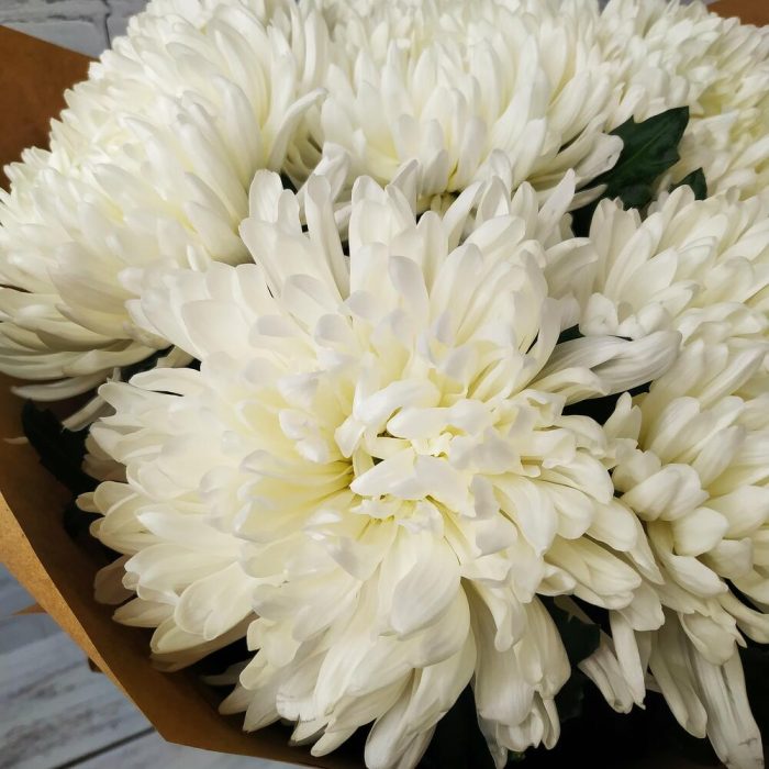 Прекрасный букет из белых хризантем, станет идеальным подарком для самых любимых и близких!Памятка для букета:1. Чистая вода раз в сутки.2. Стебли подрезаем на 0,5см при каждой смене воды.3. Ставим в прохладное место, но не у окна.4. Чтобы вода оставалась свежей, не допускайте попадания листьев и лепестков в воду.Друзья, обратите внимание, что цвет упаковки может быть другим, в зависимости от наличия на складе.