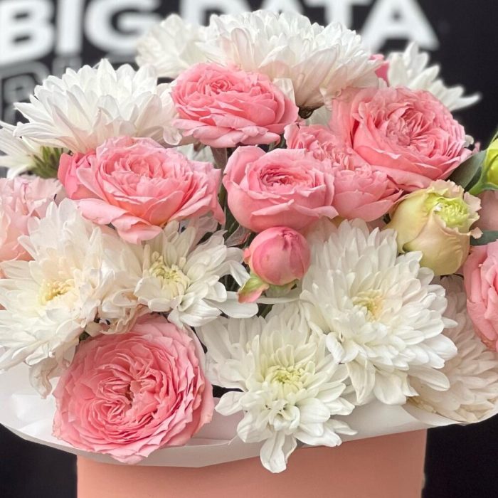 Хризантемы и Пионовидные кустовые розы в коробке + открытка ручной работы в подарок