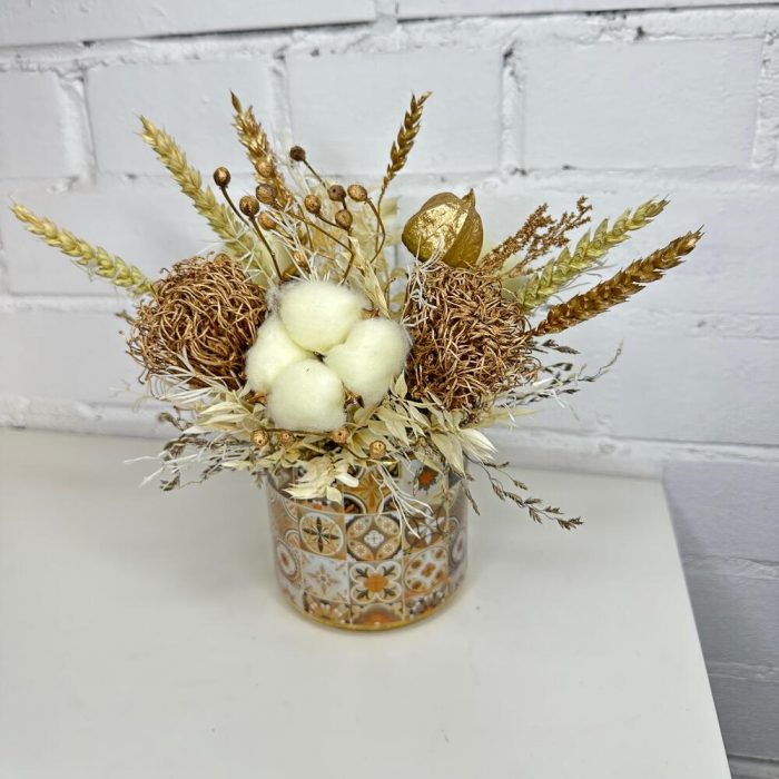 Колосья – 7 шт.Кашпо керамическое – 1 шт.Оазис флористический – 1 шт.Гелихризум – 3 шт.ларгус – 10 шт.гипсофила стабилизированная – 3 шт.леукондендрон – 2 шт.Хлопок – 3 шт.