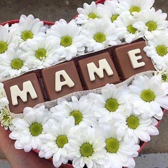 Хризантема кустовая – 7 шт.Шоколадные буквы – 4 шт.Коробка – 1 шт.Оазис флористический – 1 шт.Пленка – 1 шт.